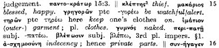 I've been working on Revelation 16:13-17, particularly focusing on the syntax, morphology and some lexical data. For today, I submit Revelation 16:15 as a text to ponder and analyze: