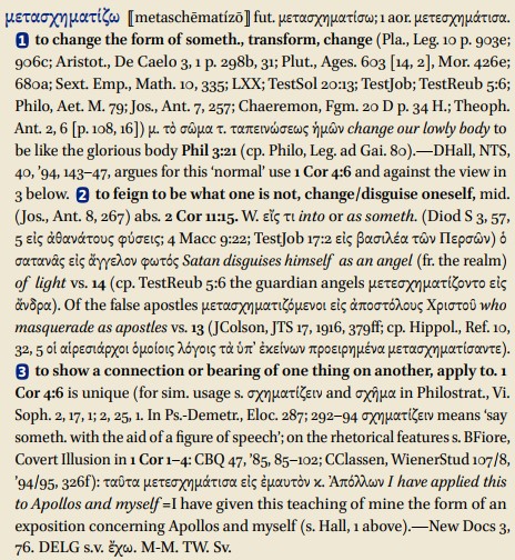 There are five GNT occurrences of μετασχηματίζω. The form that appears in 2 Corinthians 11:14 (μετασχηματίζεται) is present middle indicative 3rd person singular.